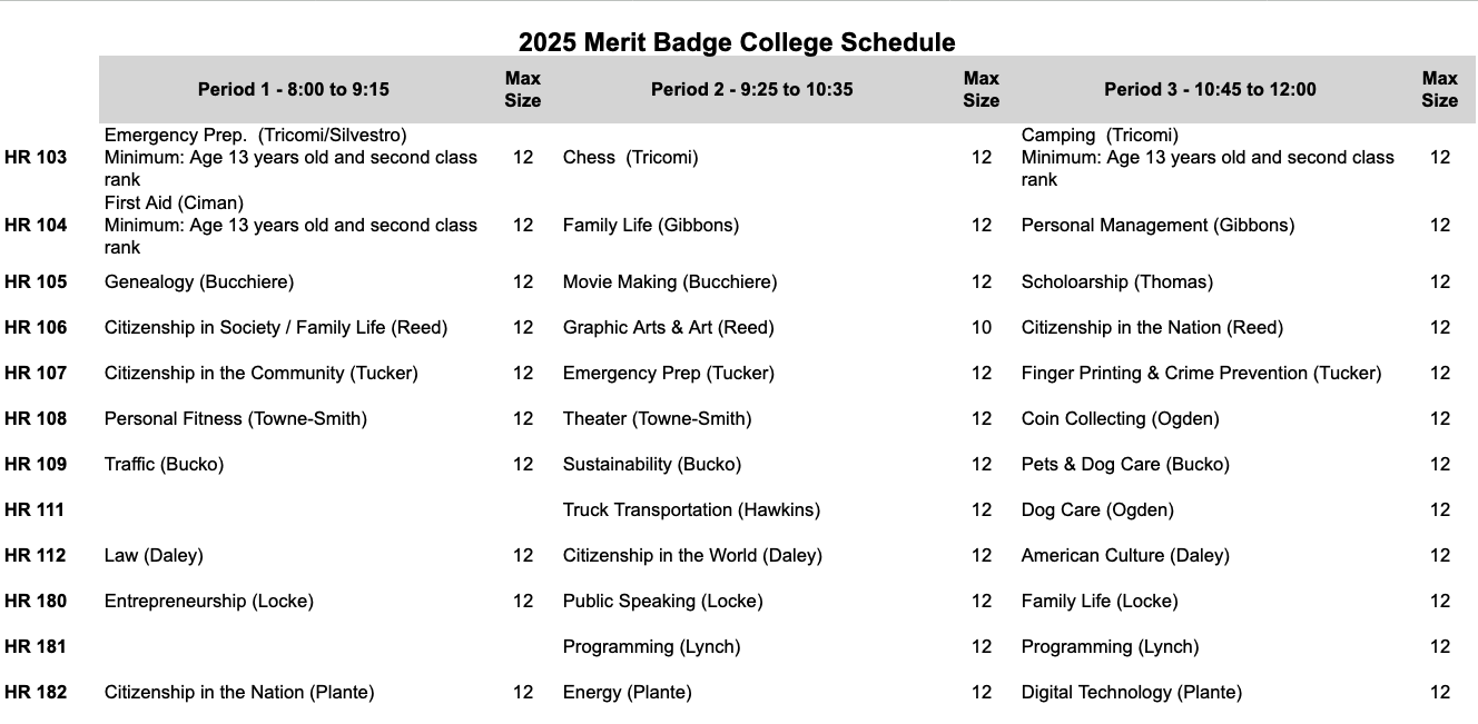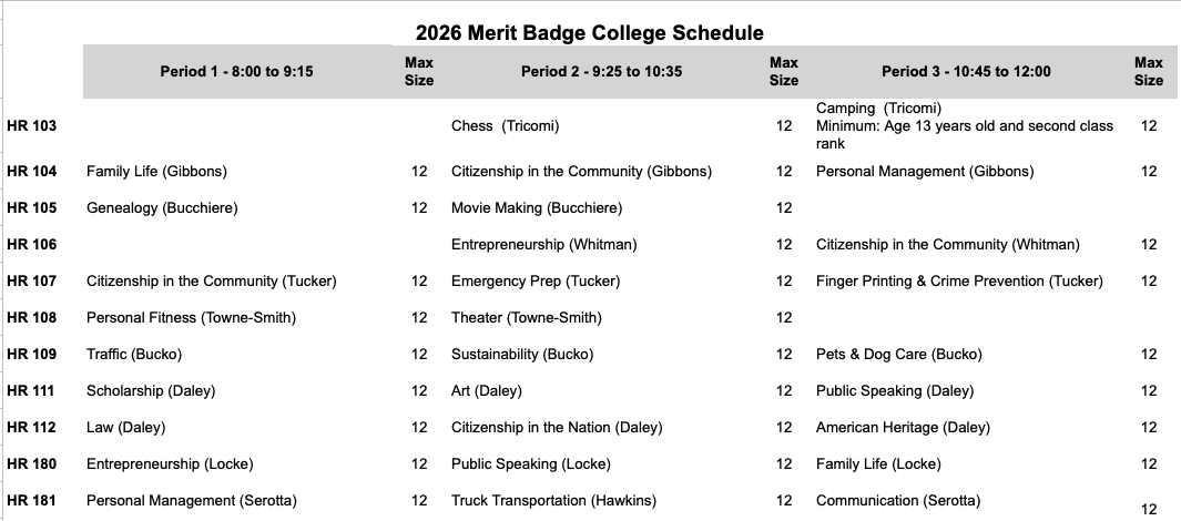 2026 Merit Badge Class Schedule